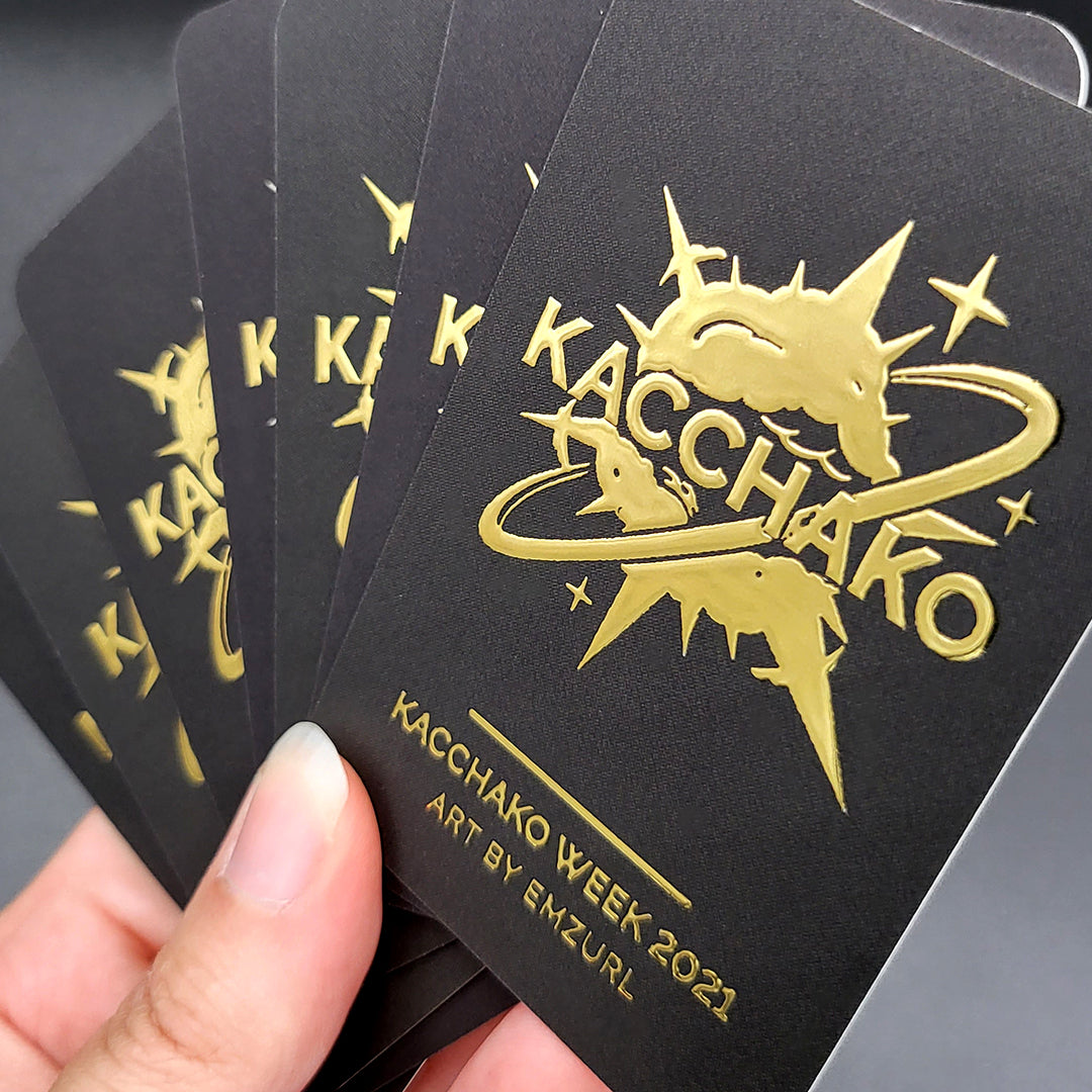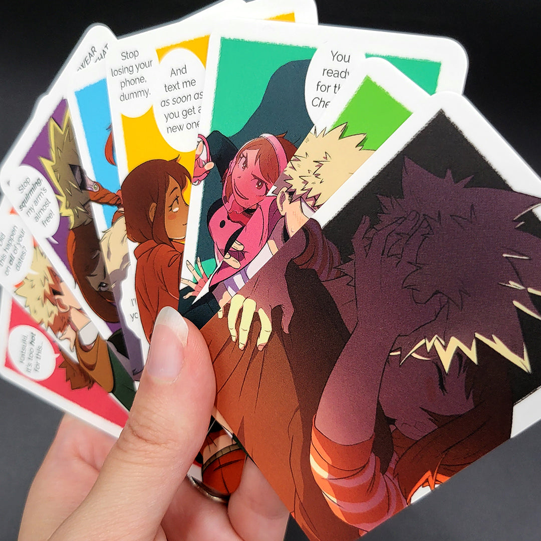 The front of each card has 1 of 8 vibrantly printed illustrations emzurl created for Kacchako Week (2021), while the back includes a foil printed "KACCHAKO" logo. All cards are 2.16" x 3.3" (5.49cm x 8.38cm).