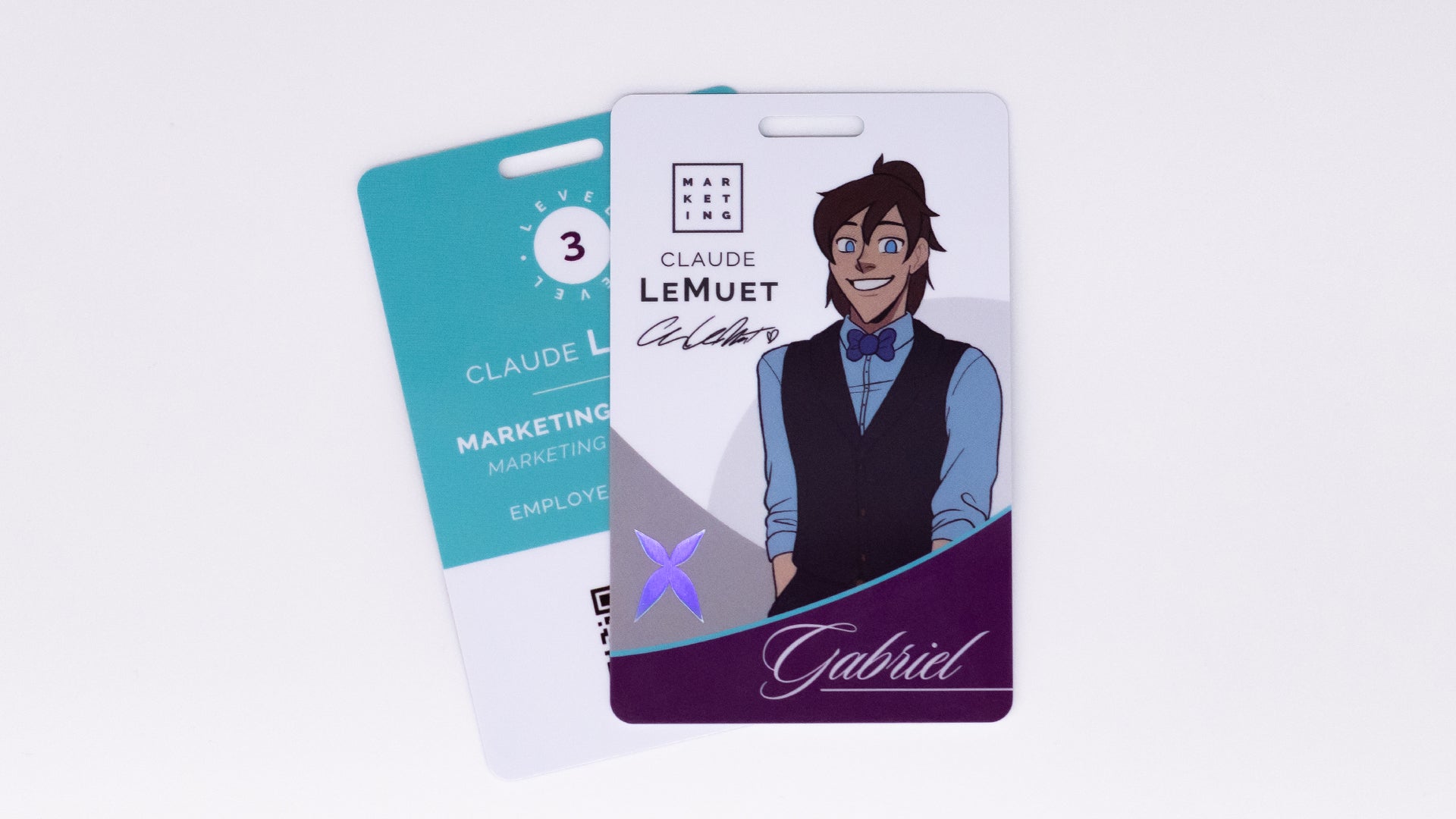 Ever wonder what access level Felix has or Claude's actual job title in the Marketing Department? Well now you can hold this information in your hand! Each PVC ID Card is double sided with each character's headshot from when they joined the company, signature, job title, hiring year, and more! The QR code links to the ML Office AU carrd site so you can stay updated on the series!
