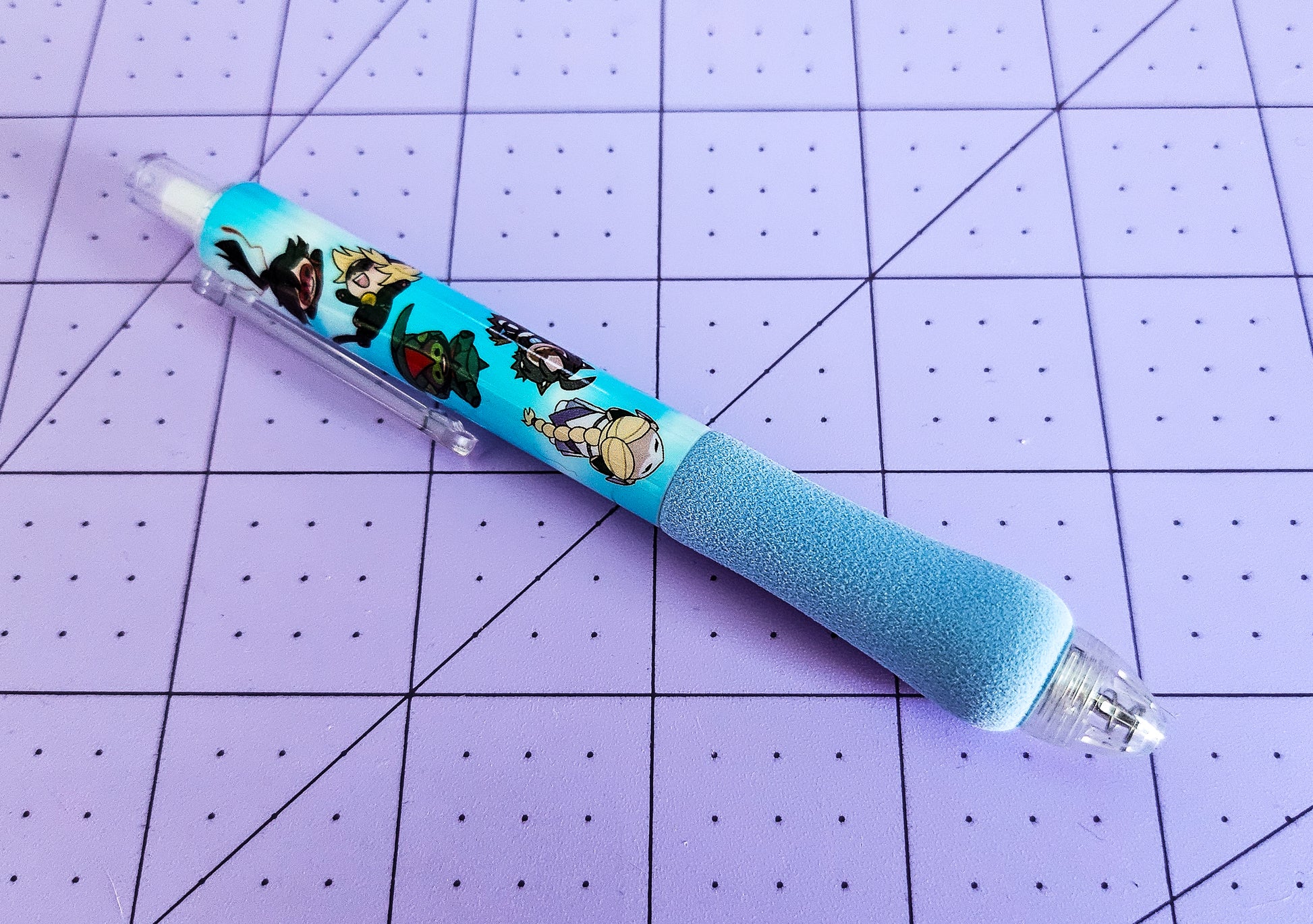 Let the Office AU heroes guide your hand and give you strength while writing with this custom printed pen! This retractable plastic pen comes with a thick foam grip and printed illustration of our favorite beans falling through the sky.