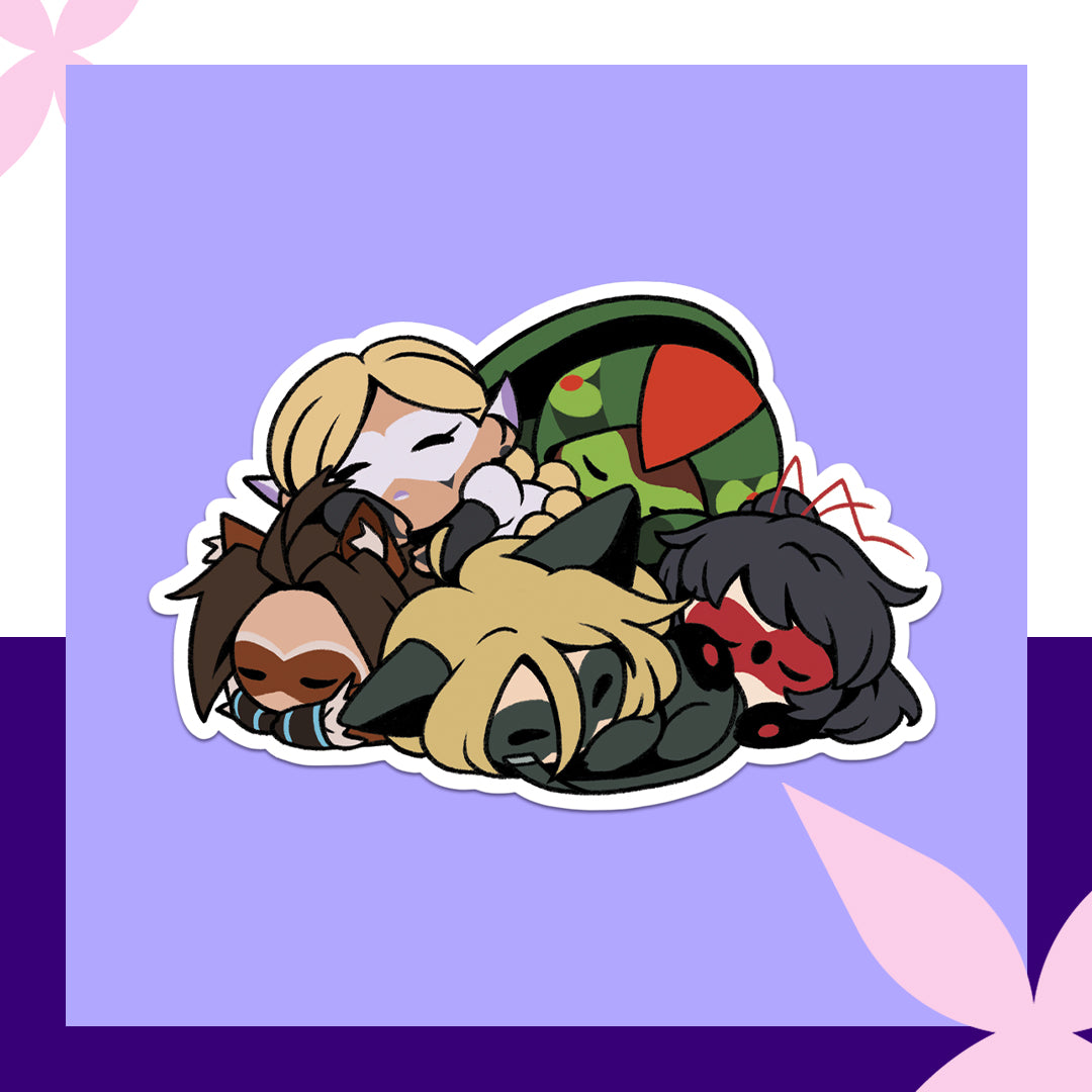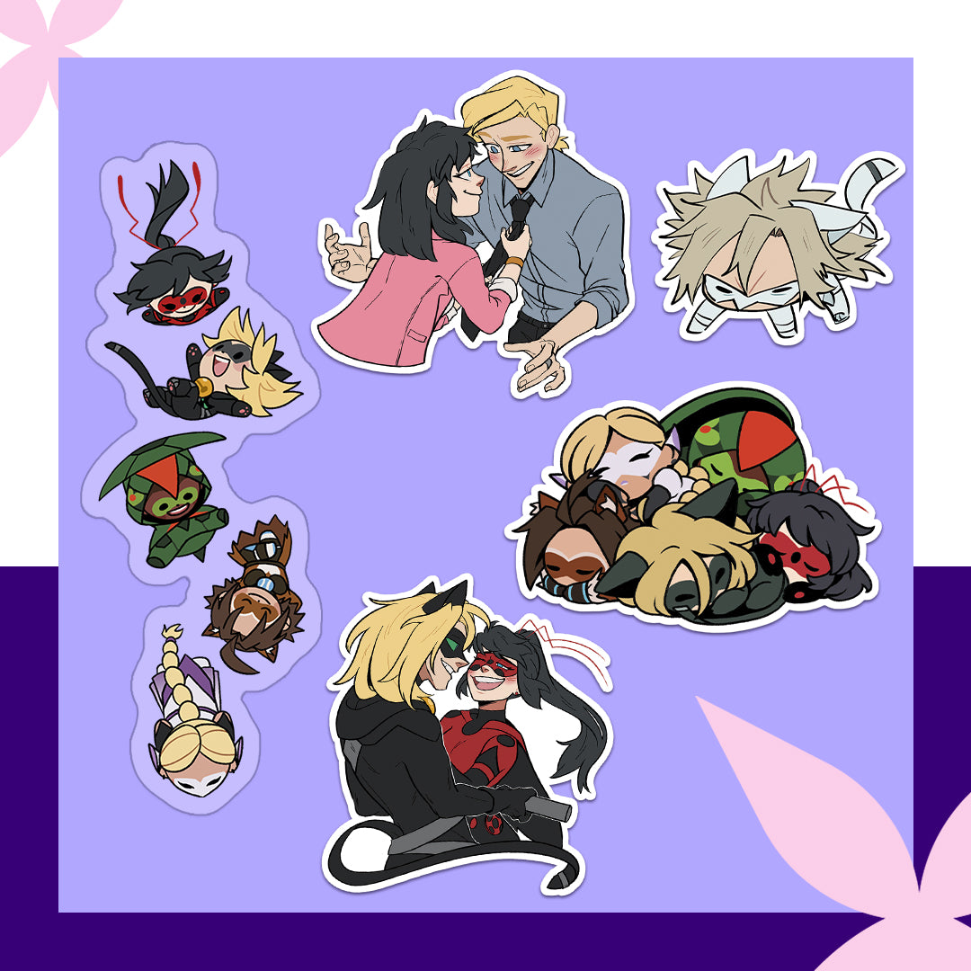 Originally from the second Miraculous Office AU collection, From Employees to Heroes, these stickers include Felinette (3"), Ladynoir (3"), a feral Chat Blanc (2"), a pile of tired heroes (3"), and falling hero beans (4").