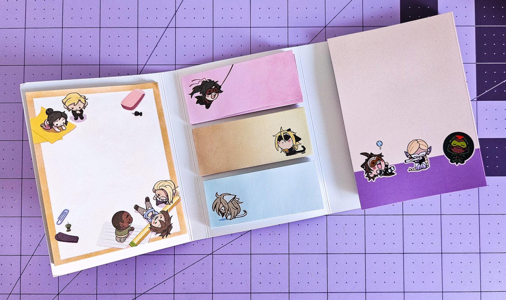 Save that page, jot that note, mark your favorite paragraphs for easy re-reading. This sticky pad set comes with two 3" x 4" pads and six 3" x 1.25" sticky tabs, each with illustrations of the main Office AU cast, all packaged in a foldable cover.