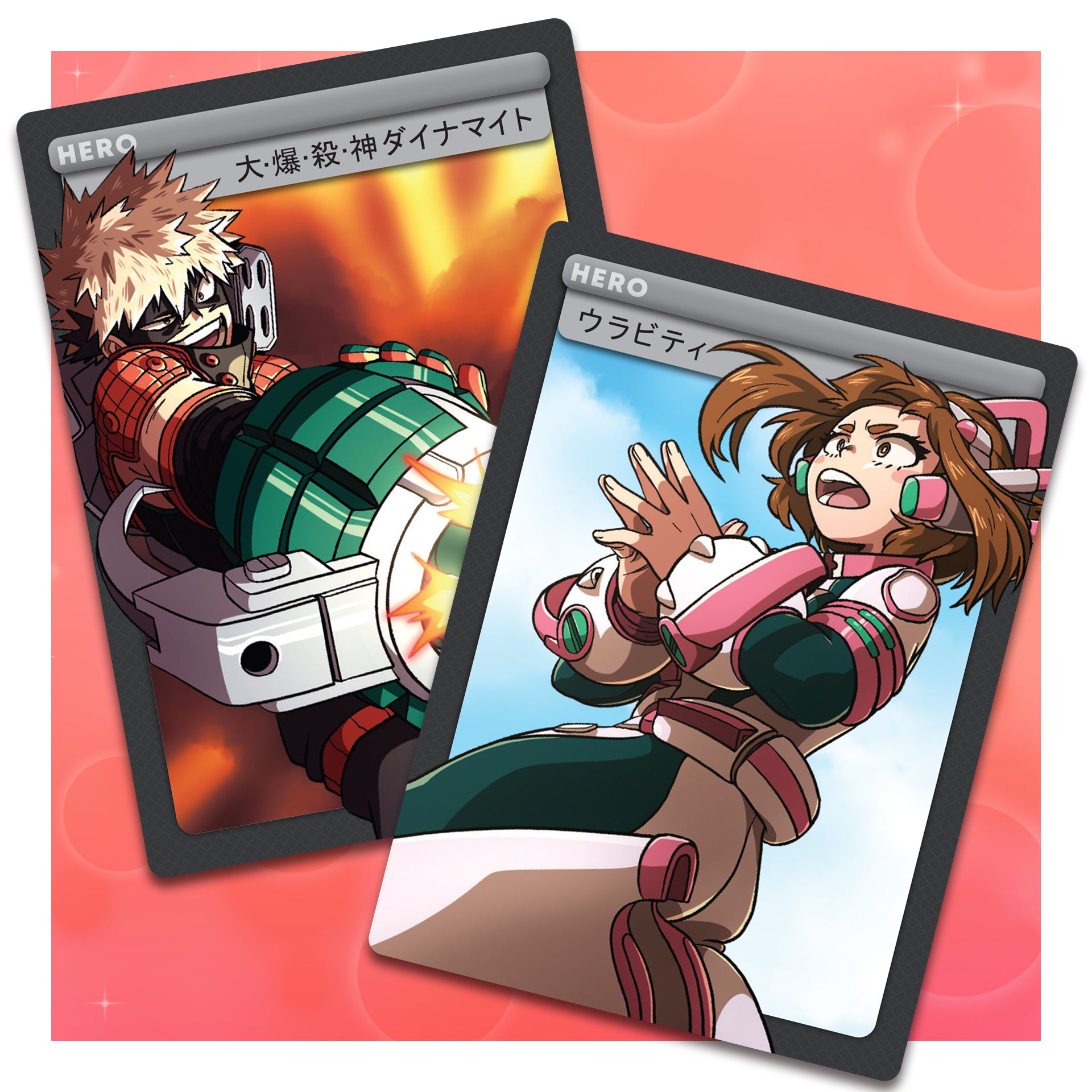 Kacchako's professional career as heroes is official: they have trading cards! These double-sided trading cards by emzurl highlight Uravity and Dynamight's hero work and are essentials for any collection. Featuring UV spot gloss on the front of both cards.